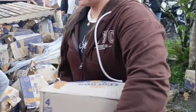 Circulan videos en grupos de WhatsApp y redes sociales que muestran el momento en que varias personas aprovechan el volcamiento de un camiónpara llevarse productos que quedaron esparcidos sobre la carretera tras el siniestro.